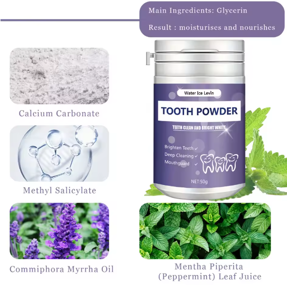 AuraCharm teeth whitening powder provides a teeth whitening powder, unlike other teeth whitening powders, we have removed the usual harmful ingredients found in normal versions, ensuring your safety!